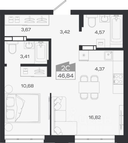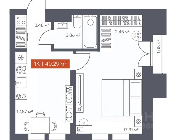 Выполнена стяжка с шумоизоляцией, ровные межкомнатные стены, разводка электроснабжения — остается только финишное покрытие. Возможны варианты с отделкой под ключ*.