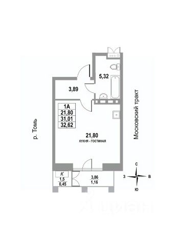 -Санузел — 3,86 м² (с ванной) — Компактный, но функциональный — вмещает все необходимое.