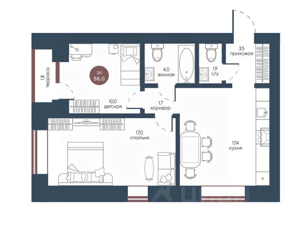 Продаётся 2-комнатная квартира в сданном доме (Корпус 2), срок сдачи: IV-кв. 2025, общей площадью 56 кв.м., на 7 этаже.