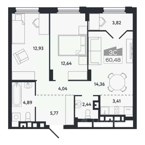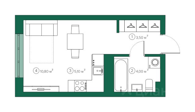 Выполнена стяжка с шумоизоляцией, ровные межкомнатные стены, разводка электроснабжения — остается только финишное покрытие. Возможны варианты с отделкой под ключ*.