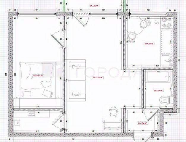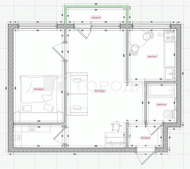 Общая площадь квартиры 18,7 кв.м. В комнате выделена кухонная зона, обустроенная новым кухонным гарнитуром.
