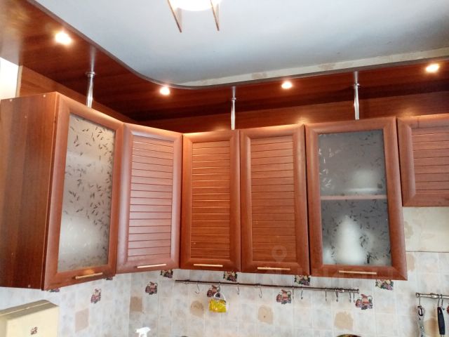 Сан узел в кафеле, поклеины обои, натяжные потолки, окна пластик, балкон пластик, на полу, линолеум, встроенный угловой шкаф, кухонный гарнитур.