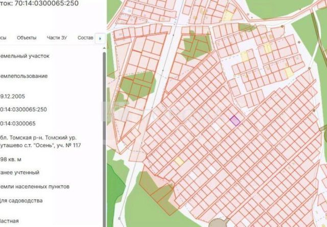 Продам земельный участок в СНТ Осень 6 соток, ровный (без уклона), правильной формы, рядом с посёлком Мирный, заезд с двух сторон - как со стороны п.Мирный, так со стороны п.Заварзино, что очень удобно (от Академа менее 5км, от Степановки также). Участок 117 (недалеко от пересечения улиц Овражная и Липовая). Кадастровый номер 70: 14: 0300065: 250. Зимой дорога есть! СНТ активно развивается - отсыпаются дороги, проведены электросети, планируется газификация. По договорённости, могу оформить подключение э/э.