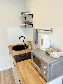 — полноценная кухня: плита, микроволновка, холодильник, набор посуды, кофе, чай, конфеты и базовые специи уже ждут