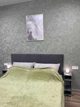 Кухня оснащена необходимой бытовой техникой, включая холодильник, плиту и микроволновую печь. Предусмотрено место для установки посудомоечной машины. В гостиной установлен телевизор, двуспальный диван и обеденный стол со стульями. В спальне есть удобная кровать и вместительный шкаф.