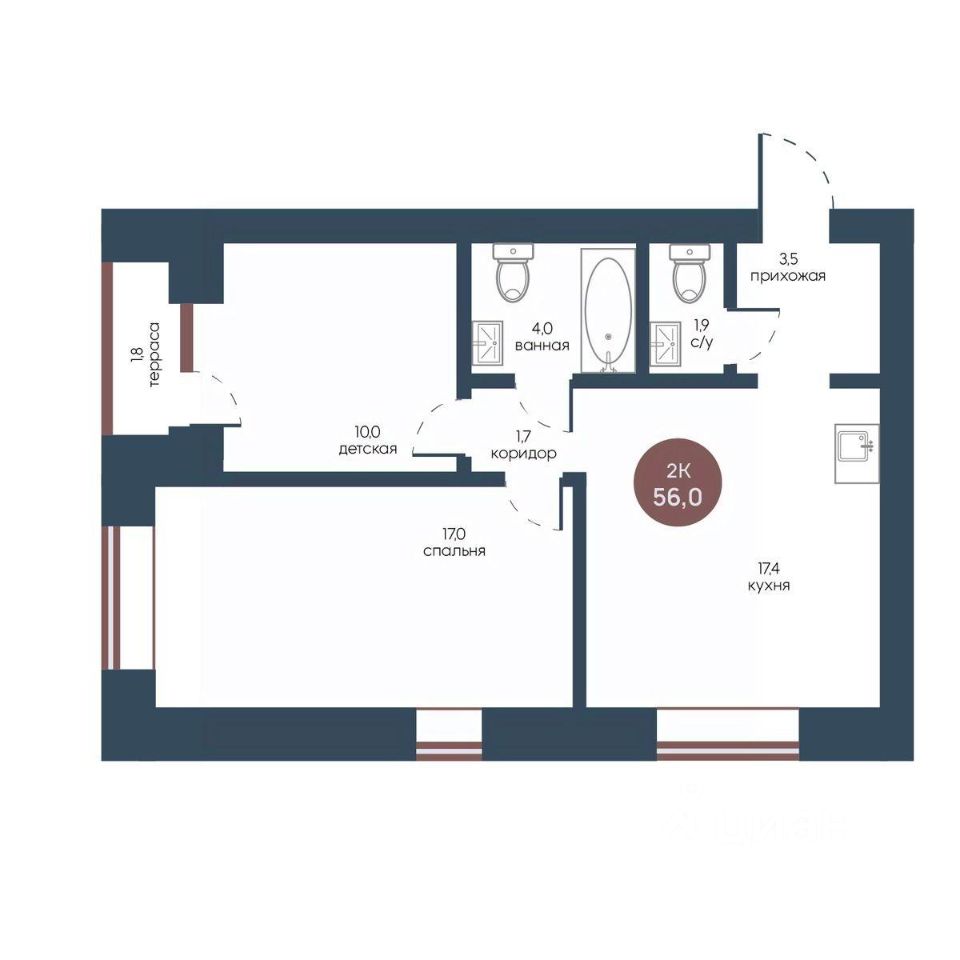 Продаётся 2-комнатная квартира в строящемся доме (Корпус 2), срок сдачи: IV-кв. 2025, общей площадью 56 кв.м., на 7 этаже.
