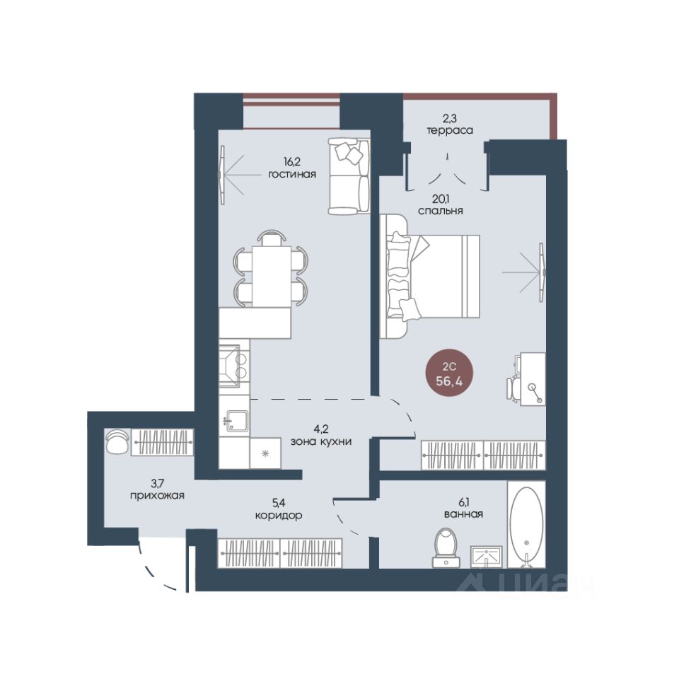Продаётся 2-комнатная квартира в строящемся доме (Корпус 1), срок сдачи: IV-кв. 2025, общей площадью 56.4 кв.м., на 7 этаже.