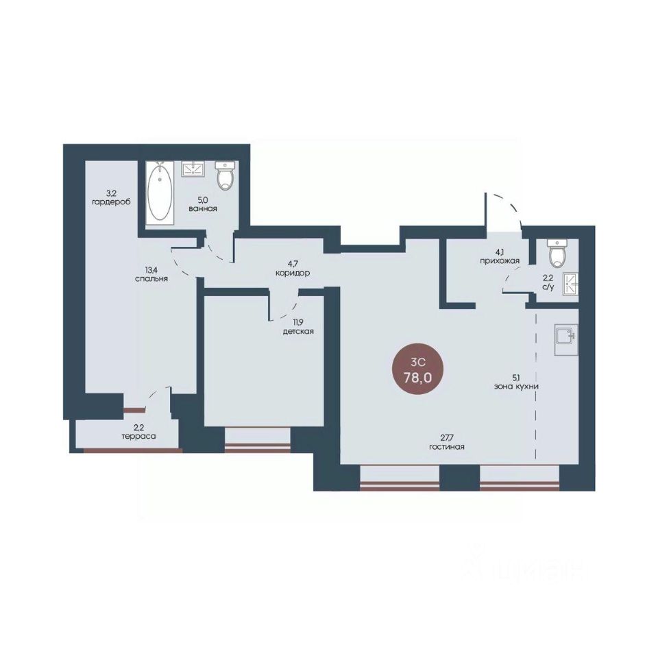 Продаётся 3-комнатная квартира в строящемся доме (Корпус 1), срок сдачи: IV-кв. 2025, общей площадью 78 кв.м., на 7 этаже.
