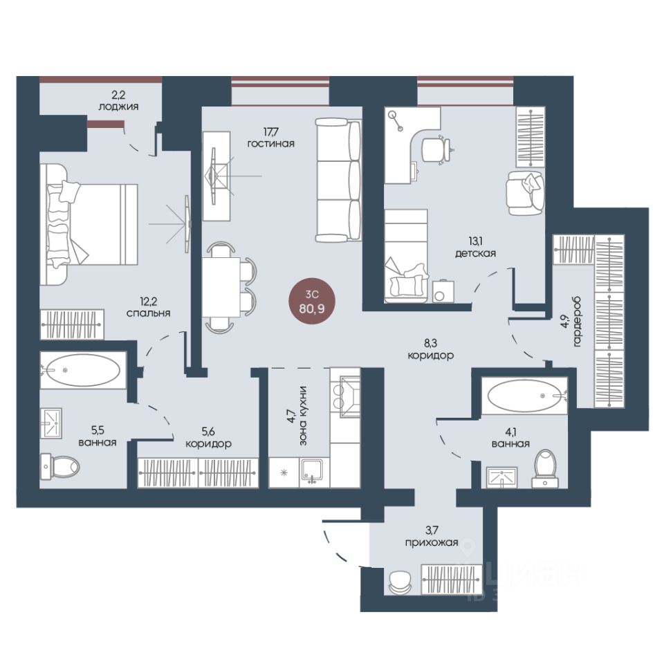 Продаётся 3-комнатная квартира в сданном доме (Корпус 1), срок сдачи: IV-кв. 2025, общей площадью 80.9 кв.м., на 1 этаже.