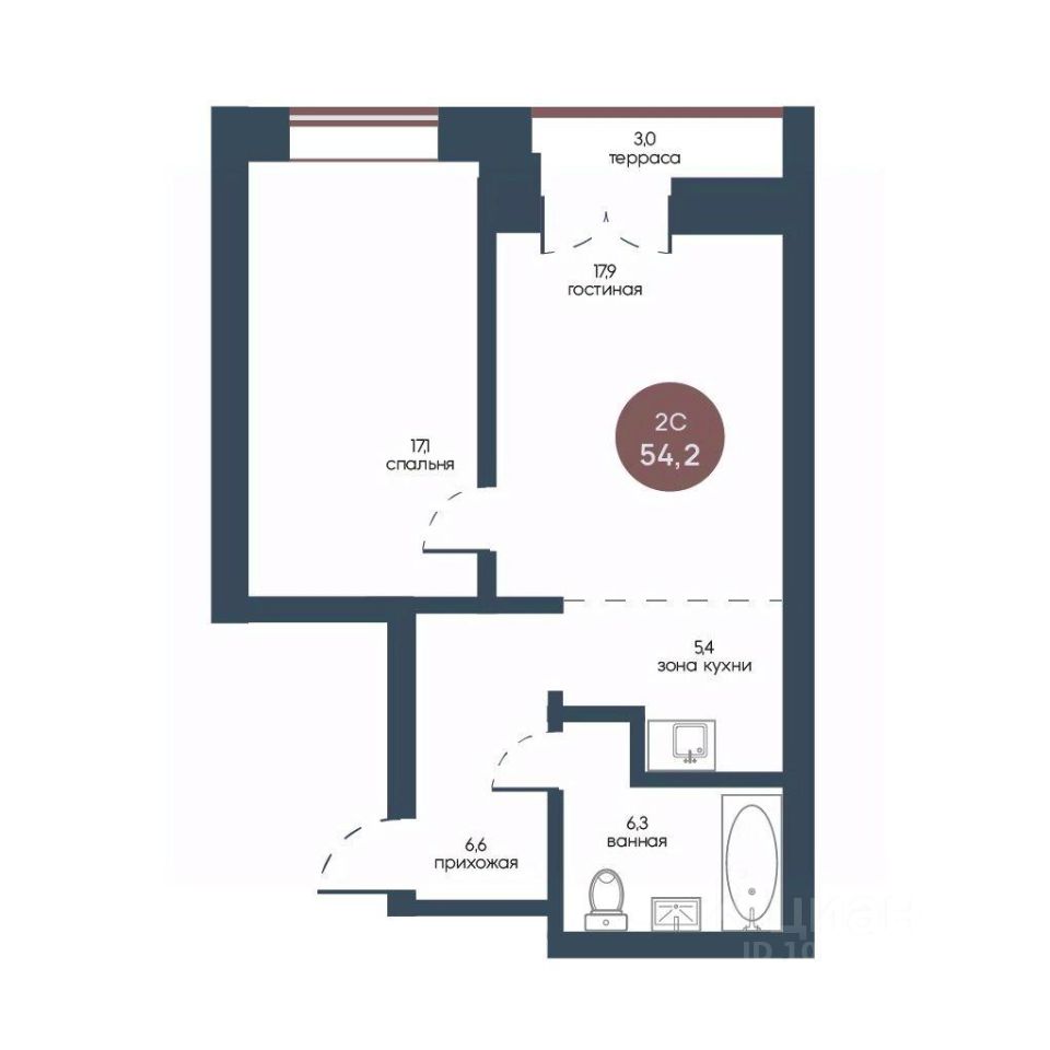 Продаётся 2-комнатная квартира в строящемся доме (Корпус 1), срок сдачи: IV-кв. 2025, общей площадью 54.2 кв.м., на 7 этаже.