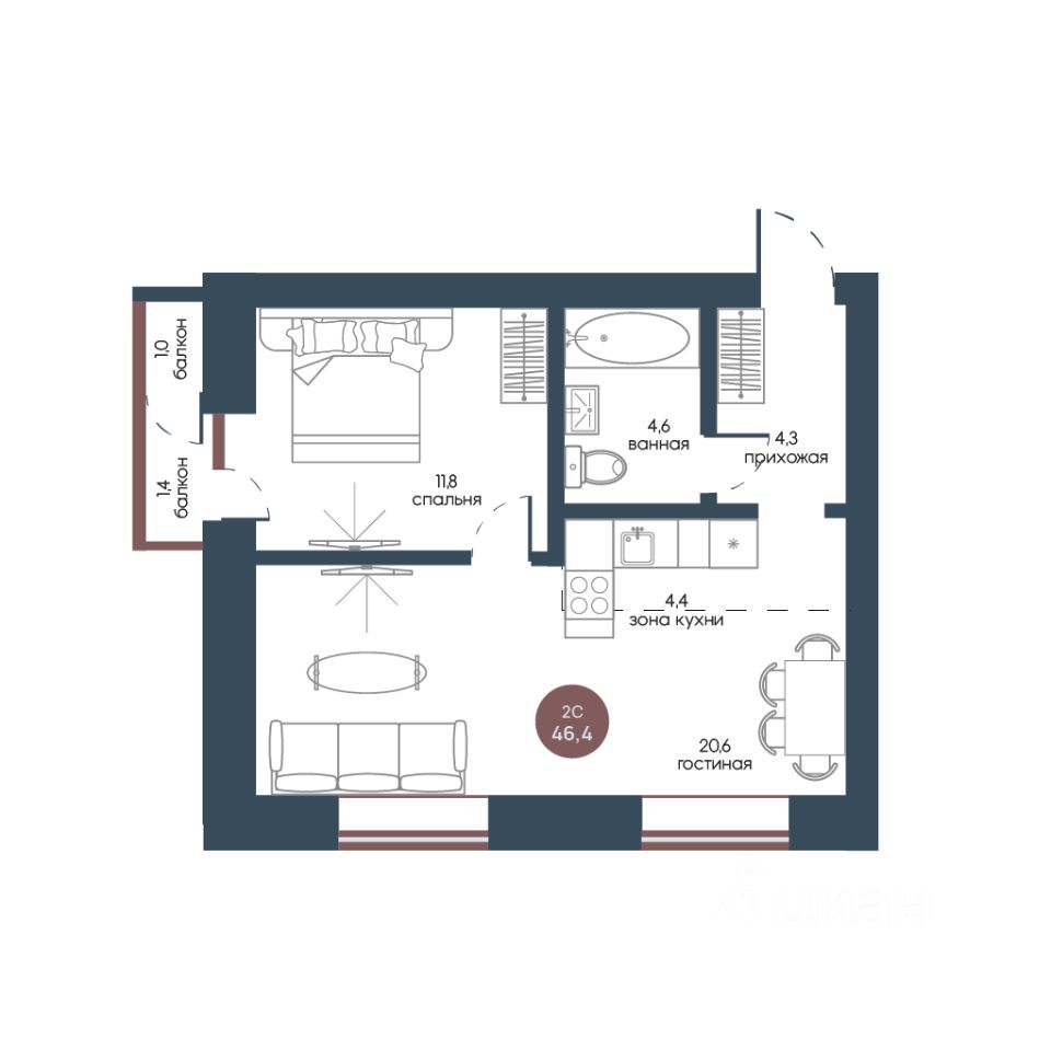 Продаётся 2-комнатная квартира в строящемся доме (Корпус 1), срок сдачи: IV-кв. 2025, общей площадью 46.4 кв.м., на 4 этаже.