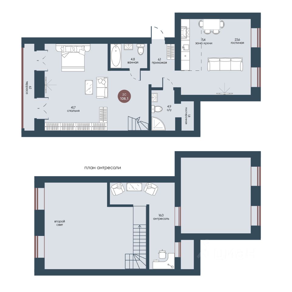 Разнообразные планировки и нестандартные архитектурные решения. Квартиры с террасами, окном в ванной, вторым светом, гардеробными и мастер-спальнями.