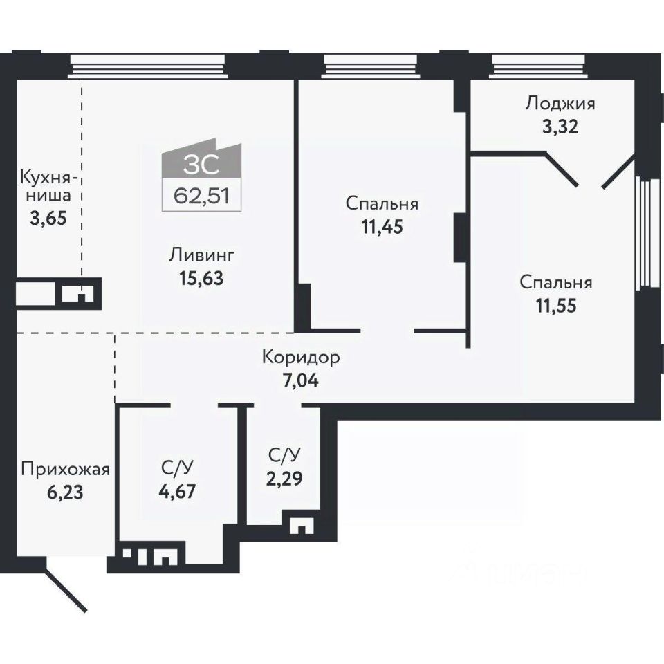 Общая площадь62,51 м²