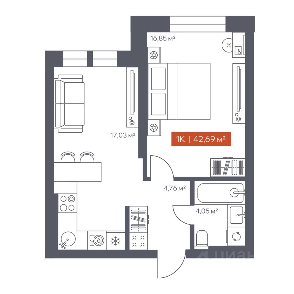 В архитектурном доме "Ломоносов" в продаже квартира N 80 площадью 42.69 кв.м. Внешние и внутренние стены из кирпича, высокие потолки, панорамные окна и утепленная лоджия. Квартира сдается в отделке white box.