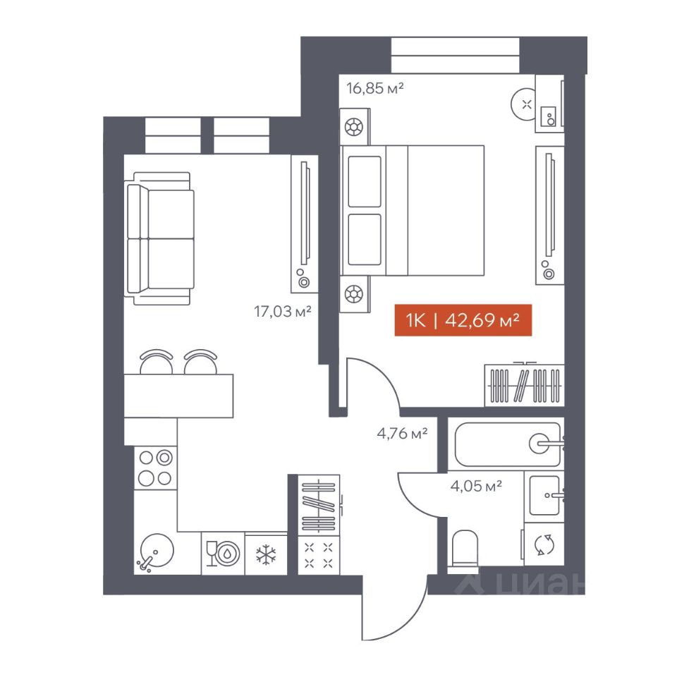 В архитектурном доме "Ломоносов" в продаже квартира N 86 площадью 42.69 кв.м. Внешние и внутренние стены из кирпича, высокие потолки, панорамные окна и утепленная лоджия. Квартира сдается в отделке white box.