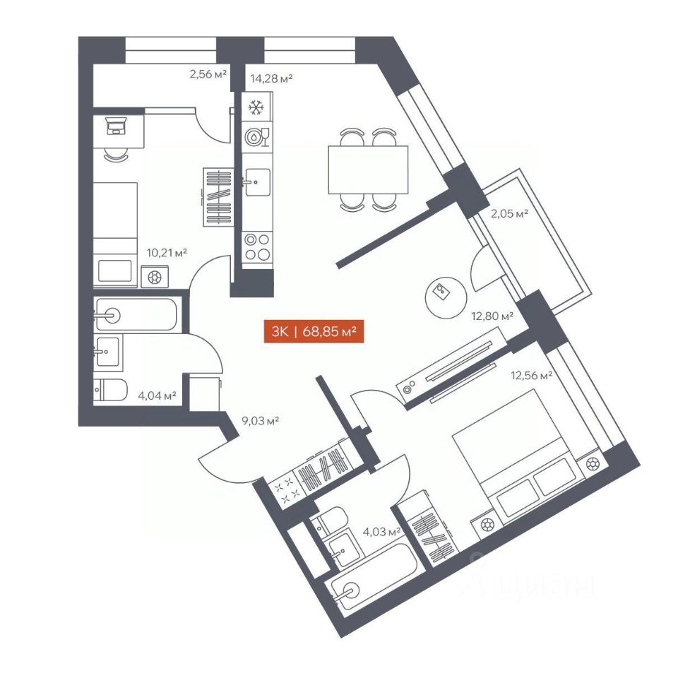 В архитектурном доме "Ломоносов" в продаже квартира N 293 площадью 68.85 кв.м. Внешние и внутренние стены из кирпича, высокие потолки, панорамные окна и утепленная лоджия. Квартира сдается в отделке white box.