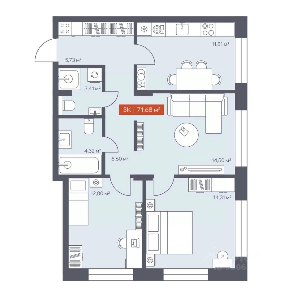 В архитектурном доме "Ломоносов" в продаже квартира N 307 площадью 71.68 кв.м. Внешние и внутренние стены из кирпича, высокие потолки, панорамные окна и утепленная лоджия. Квартира сдается в отделке white box.