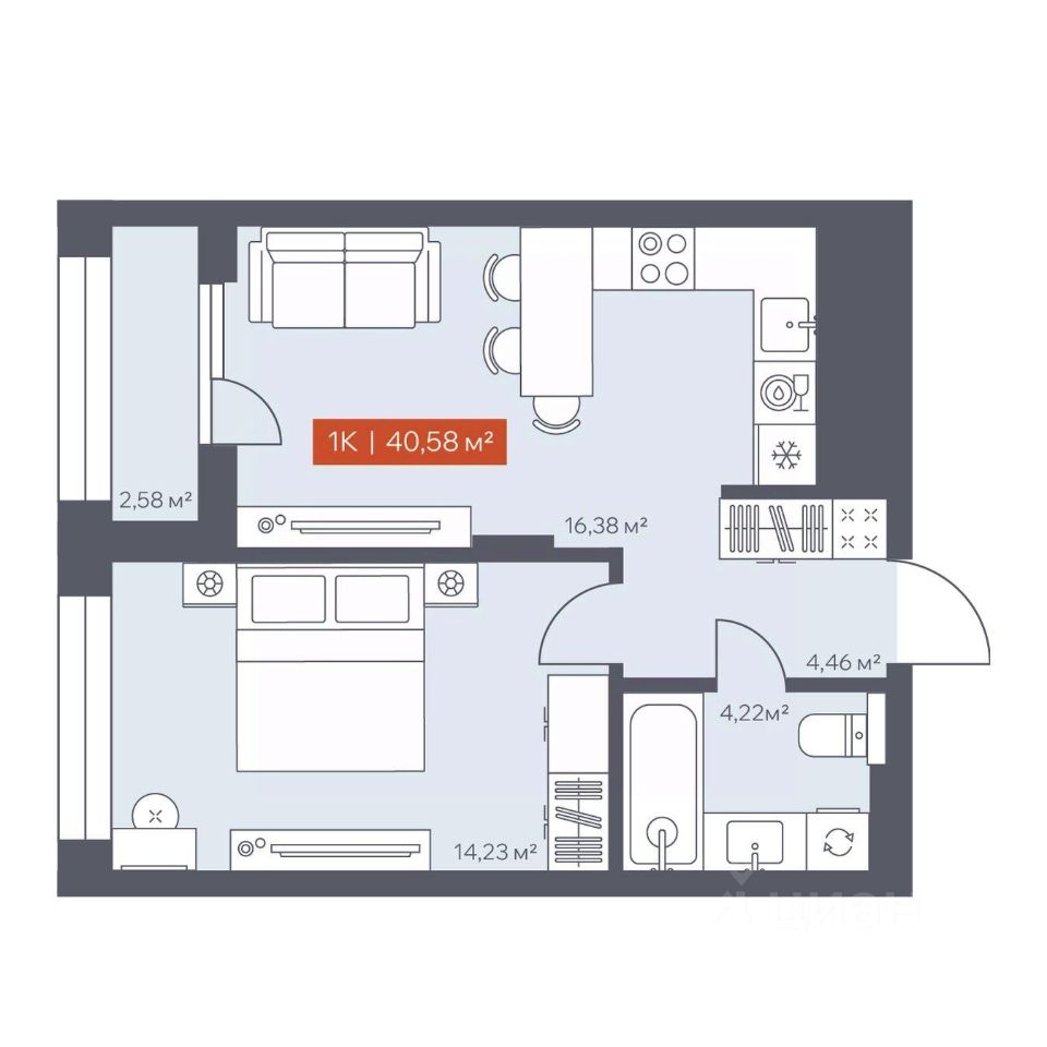 В архитектурном доме "Ломоносов" в продаже квартира N 309 площадью 40.58 кв.м. Внешние и внутренние стены из кирпича, высокие потолки, панорамные окна и утепленная лоджия. Квартира сдается в отделке white box.