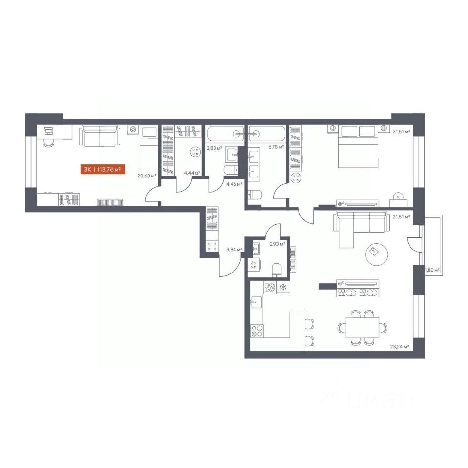 В архитектурном доме "Ломоносов" в продаже квартира N 336 площадью 113.76 кв.м. Внешние и внутренние стены из кирпича, высокие потолки, панорамные окна и утепленная лоджия. Квартира сдается в отделке white box.