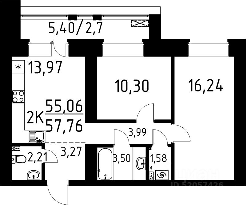 Продаётся 2-комнатная квартира в строящемся доме (Корпус Б), срок сдачи: III-кв. 2027, общей площадью 57.76 кв.м., на 8 этаже. ЖК "Лето-парк" - два корпуса: 9 и 16 этажей на 409 квартир.