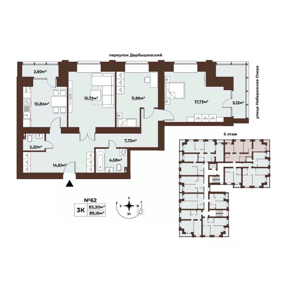 Продаётся 3-комнатная квартира в сданном доме (Дом 30), срок сдачи: III-кв. 2024, общей площадью 89.15 кв.м., на 6 этаже. Характерная черта клубного дома "Заозёрный Deluxe" - Всего 8 этажей и 85 квартир премиального сегмента, 44 парковочных места в подземном паркинге высокий уровень качества всех материалов и только самые современные технологические решения, а именно: 1. Кирпич премиального качества, от завода Ликолор, построенного по Немецким технологиям, сроком службы 100лет Материал ,который не потеряет свою популярность, актуальность и ценность отличается, за Прочность, Долговечность, Пожаростойкость, Престижную внешность (эстетику,и красоту), Морозостойкость 2. Толщина кладки стен 80 см 3. Применение высокомарочные кладочные растворы 4. Качественное выполнение кирпичной кладки по стандартам 5. Утеплитель 15см 6. Технологический зазор между утеплителем и лицевым кирпичем заполнен песком, для максимальной энергоэффективности и пожарной безопасности 7. Окна,- кашированные коричнево серый цвет, стеклопакеты Veka,французские окна с выходом на лоджию 8. Двери, -надежные, современные, повышенный уровень защиты и безопасности, стоимость от 50 000рублей за одну дверь 9. Умный дом/консьерж сервис 10. Панорамные лоджии, - кашированные коричнево серый цвет 11. Предусмотрен вывод коммуникаций под установку кондиционеров на лоджии 12. Качество всех работ обеспечивается системой двойного строительного контроля со стороны лично застройщика и генерального подрядчика. "Заозерный Deluxe " - это: * благоустройство территории в Европейском стиле-минимум заборов, максимум безопасности, комбинированное озеленение, с применением газонных смесей, кустарников, деревьев. ** нами будет произведена полная замена устаревших коммуникаций- водо, тепло снабжения, водоотведения и ливневой канализации с гарантийным сроком эксплуатации не менее чем 20 лет ** будет уложен новый асфальт от ул. Водяной до переулка Дербышевский ** площадки для детского и взрослого отдыха ** закрытая территория с удобными зонами для детей и взрослых. * - просторный холл для встреч, ожидания с комфортными диванчиками * - колясочная зона * - мойка лап для собак * отделка подъезда керамогранитом, стены с износостойким покрытием потолки со скрытым электропроводкой, инженерным и пожарным оборудованием -грильято * лифт грузопассажирский, повышенной комфортности 1000кг спускается напрямую в паркинг-зону * благоустройство внутриквартальной проезжей части будет выполнено за счет застройщика от ул. Водяной по переулку Заозерный, улице Набережной озера до переулка Дербышевского * Комфорт городской жизни и отличная инфраструктура- особое преимущество проекта: ДЛЯ СЕМЬИ 5 Продуктовых супермаркетов 2 Торговых центра 3 Магазина электроники 2 Строительных супермаркета СПОРТ 3 Тренажерных зала 2 Бассейна 1 Спортивный комплекс ДЛЯ ДЕТЕЙ 5 Детских садов 3 Школы и Школа искусств КРАСОТА И ЗДОРОВЬЕ 9 SPA и салонов красоты 2 Барбершопа 10 медицинских центров РАЗВЛЕЧЕНИЯ И ОТДЫХ 3 Кофейни 2 Кинотеатра и многое др