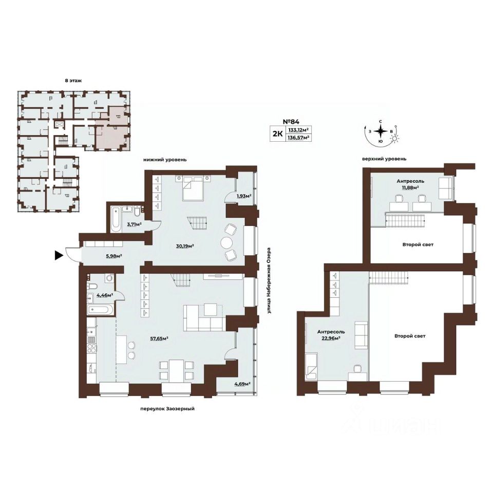 Продаётся 2-комнатная квартира в сданном доме (Дом 30), срок сдачи: III-кв. 2024, общей площадью 140.15 кв.м., на 8 этаже. Характерная черта клубного дома "Заозёрный Deluxe" - Всего 8 этажей и 85 квартир премиального сегмента, 44 парковочных места в подземном паркинге высокий уровень качества всех материалов и только самые современные технологические решения, а именно: