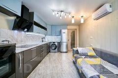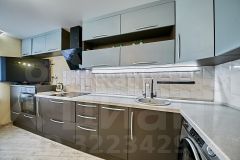 Кухня-гостиная увеличенной площади оснащена функциональной мебелью на заказ с каменной столешницей, многоуровневым освещением и всей необходимой техникой, которая остается новому владельцу.