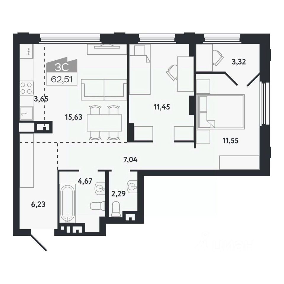 Общая площадь62,51 м²