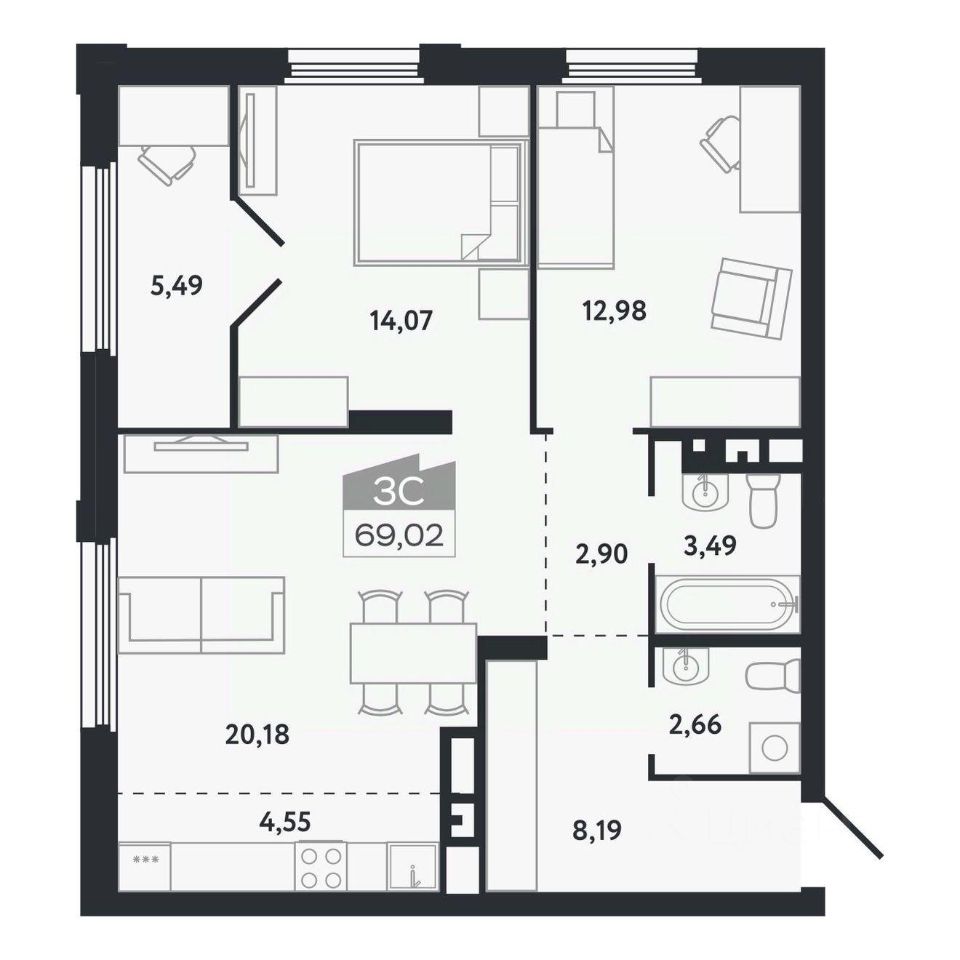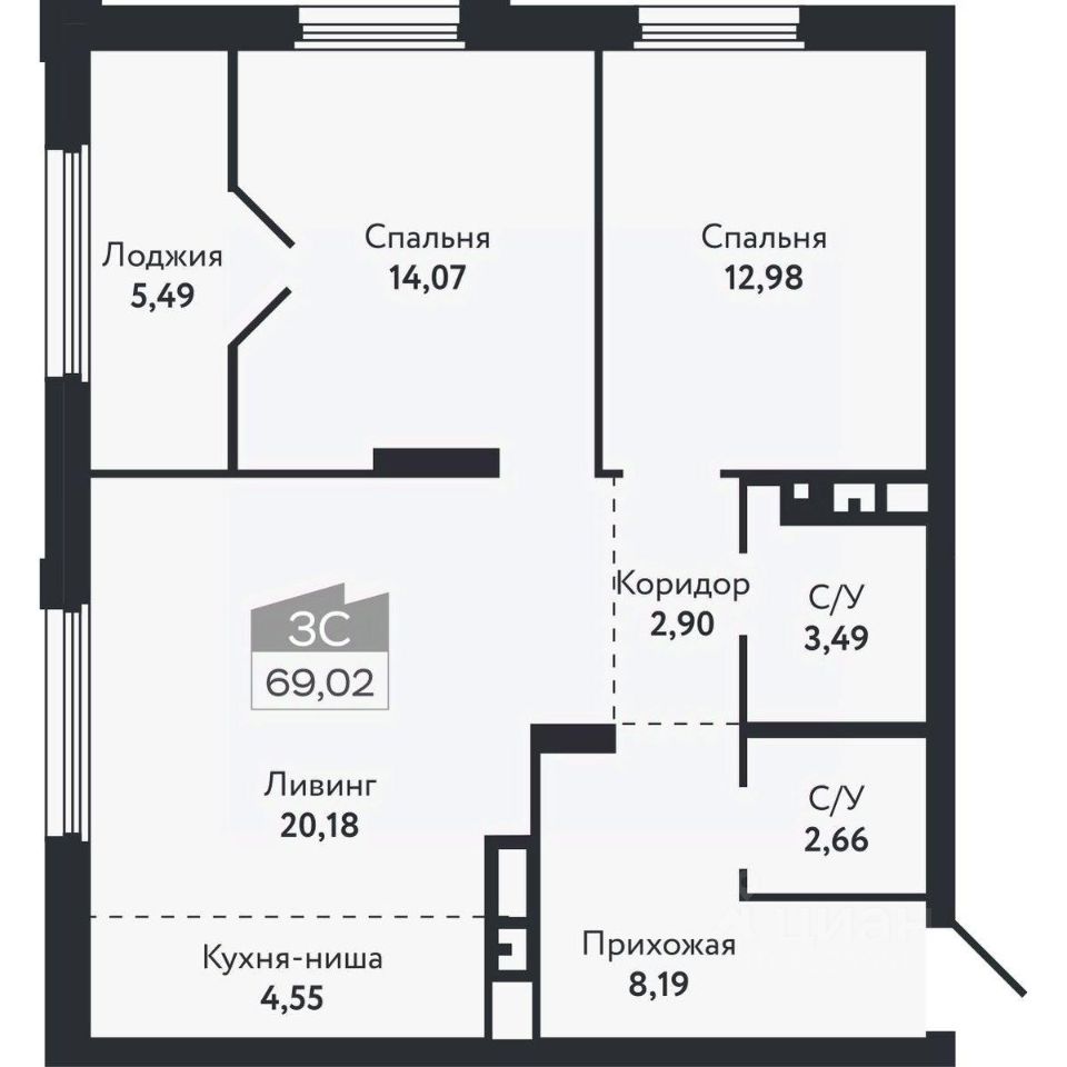 Общая площадь69,02 м²