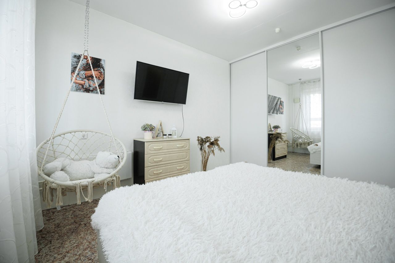 В квapтиpe остaётся пpоcтоpный шкаф-купе, кровать, кухня и остальная мебель как на фото в т.ч качель.