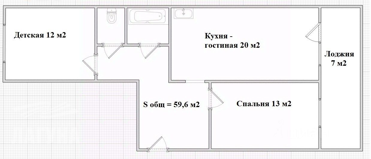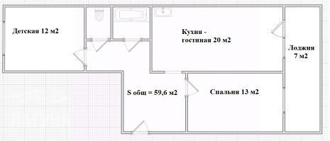 Общая площадь 59,6 м2, по документам 3-комнатная: кухня-гостиная и 2 спальни.