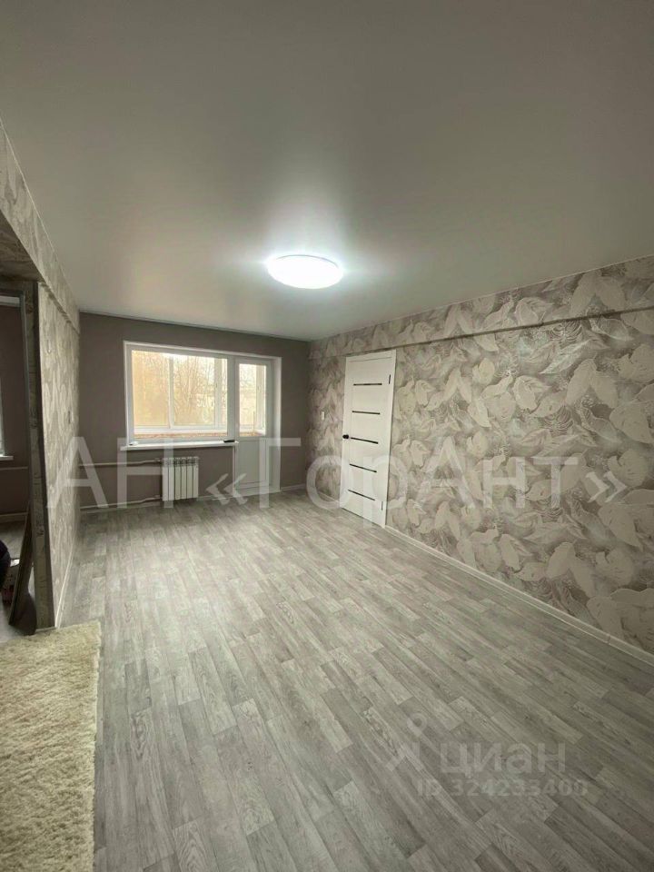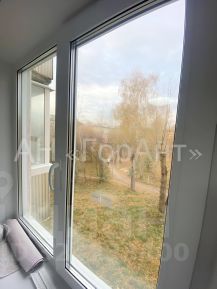 Комната: пластиковое окно, обои на стенах, линолеум на полу, на потолке установлен светильник единичный, новая батарея, гардина, розетка, выход на балкон и во вторую комнату.