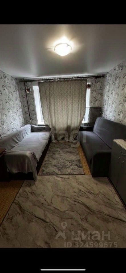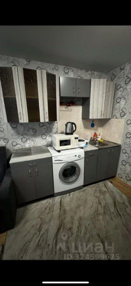 Площадь 18 м², косметический ремонт. В квартире остается вся необходимая мебель и техника: диваны, шкаф, кухонный гарнитур, холодильник, стиральная машина, микроволновка и плита.