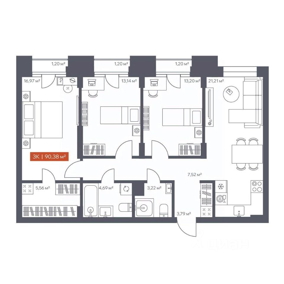 В архитектурном доме "Ломоносов" в продаже квартира N 164 площадью 90.38 кв.м. Внешние и внутренние стены из кирпича, высокие потолки, панорамные окна и утепленная лоджия. Квартира сдается в отделке white box.