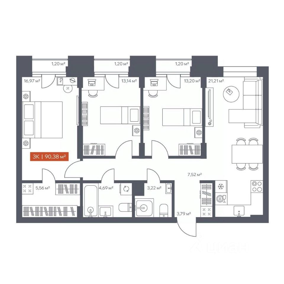 В архитектурном доме "Ломоносов" в продаже квартира N 174 площадью 90.38 кв.м. Внешние и внутренние стены из кирпича, высокие потолки, панорамные окна и утепленная лоджия. Квартира сдается в отделке white box.