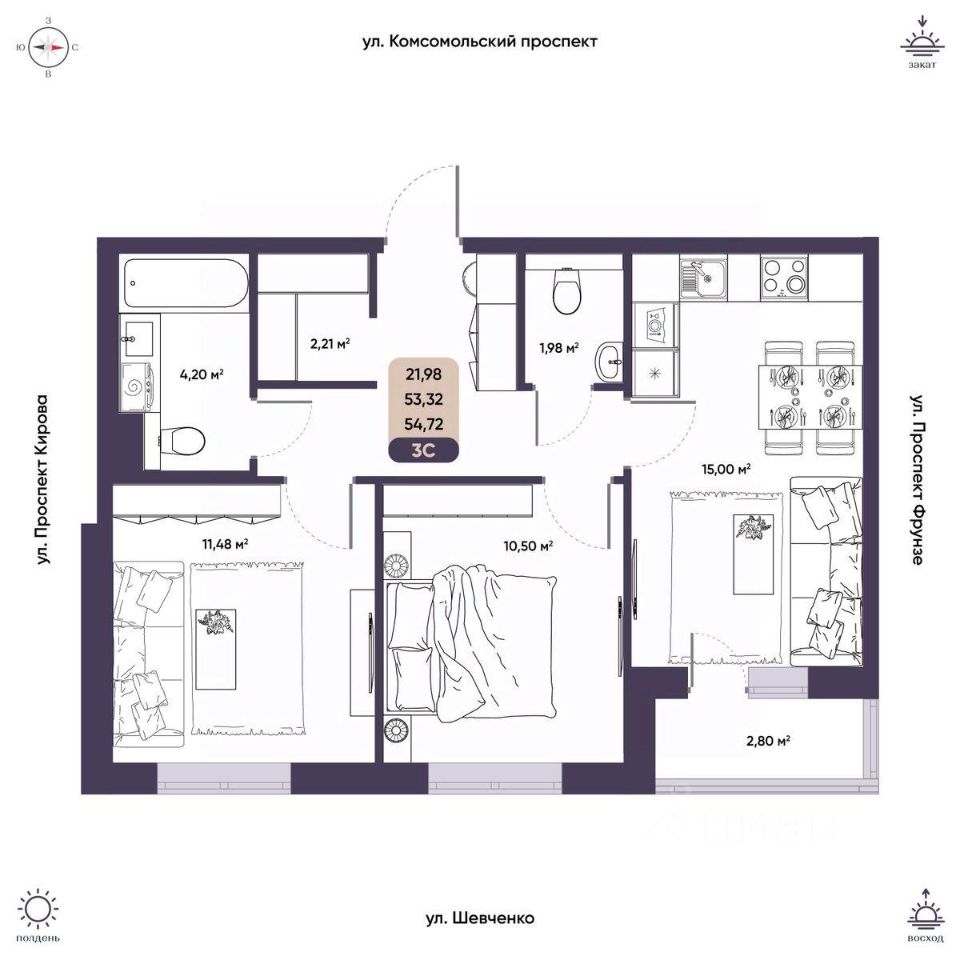 Общая площадь53,32 м²