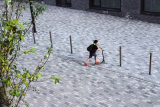 Внутренний двор Дома 1 и Дома 2 обустроен на кровле паркинга на уровне первого этажа. Вдоль бульвара расположены коммерческие помещения: магазины, аптеки, салоны красоты, кафе и офисы.