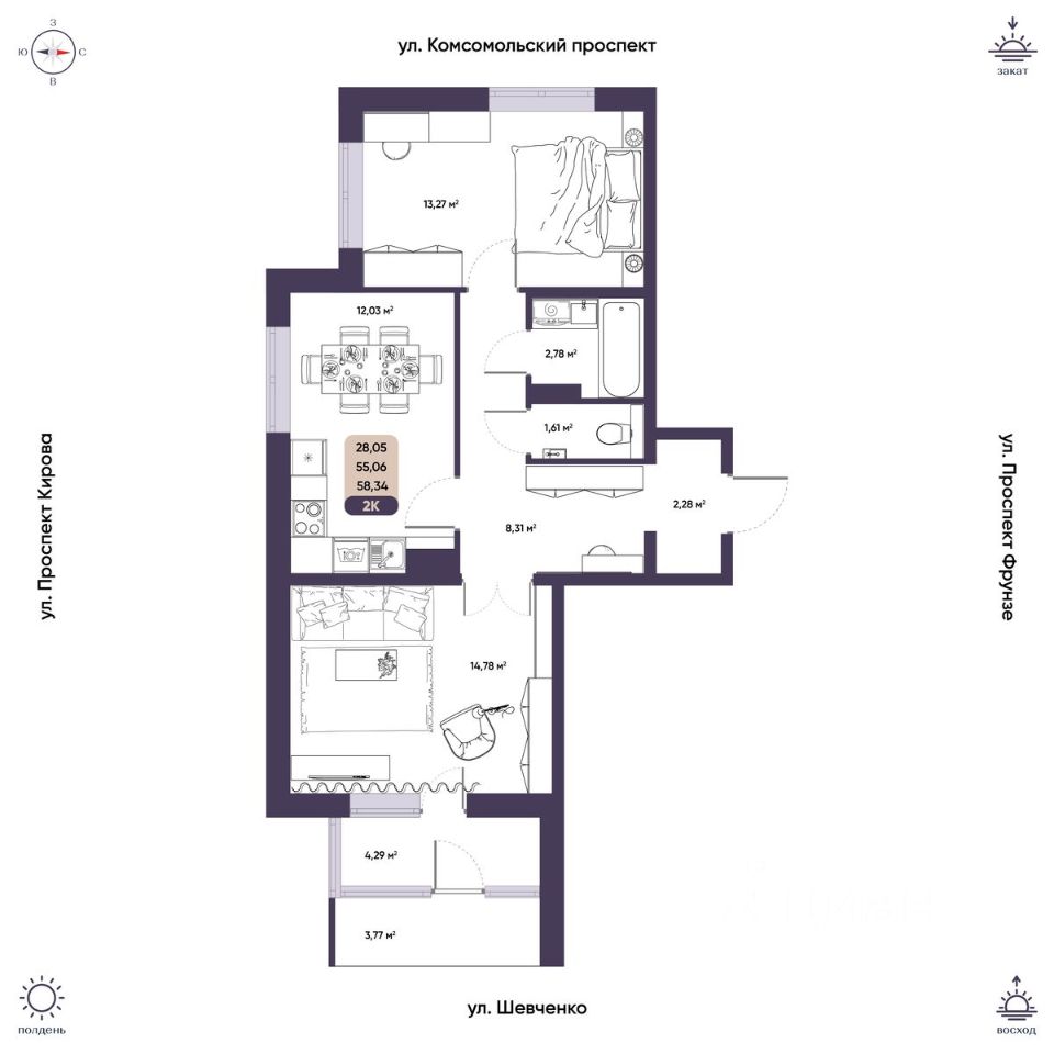 Общая площадь55,06 м²