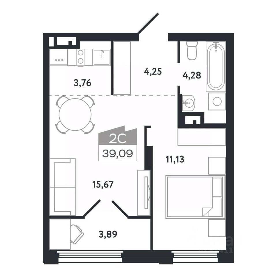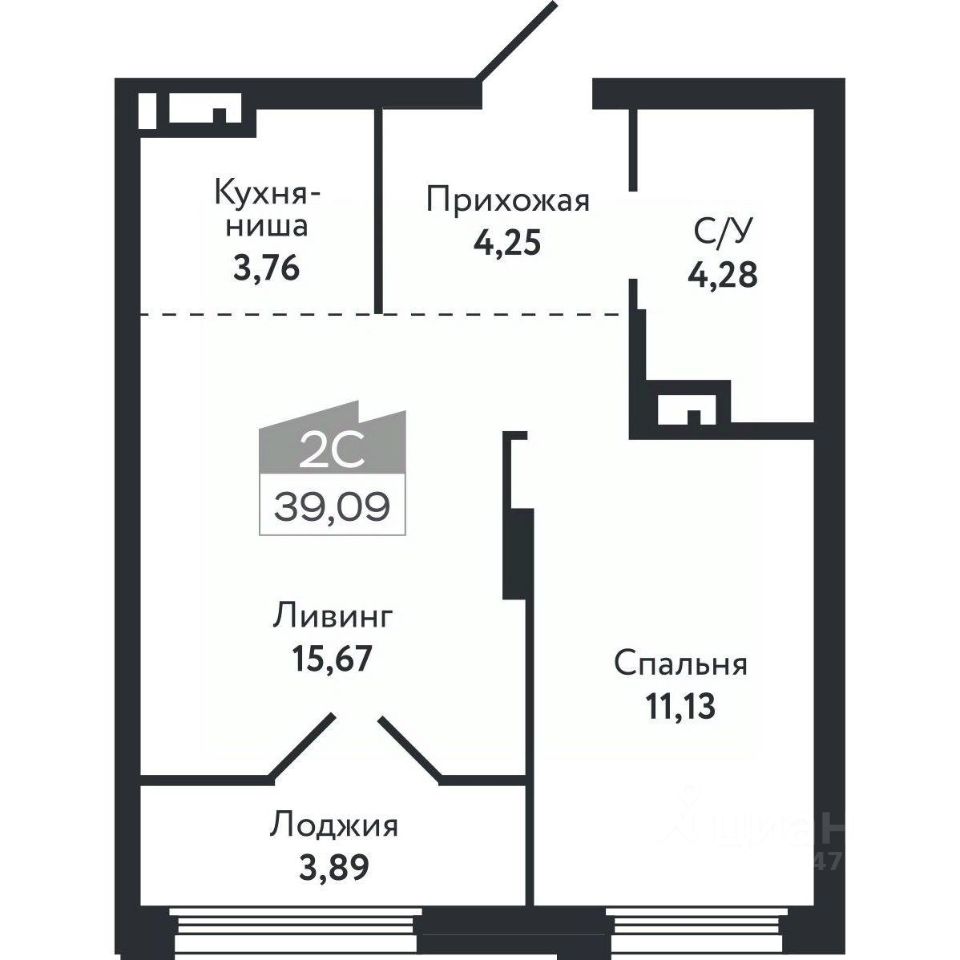 Общая площадь39,09 м²