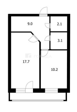 Общая площадь квартиры составляет 42,1 кв. м, из которых 17,7 кв. м — жилая площадь, 10,2 кв. м — кухня. Совмещённый санузел обеспечивает функциональность пространства.