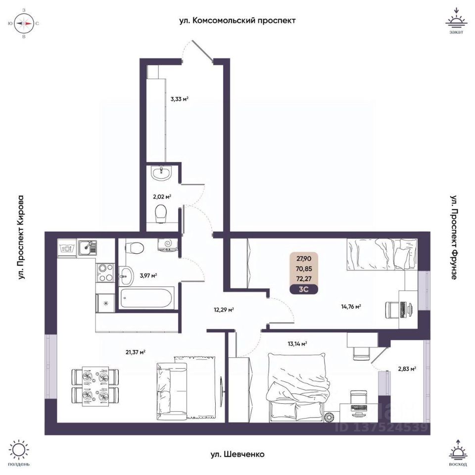 Продается 3-комн. квартира, 70,85 м²