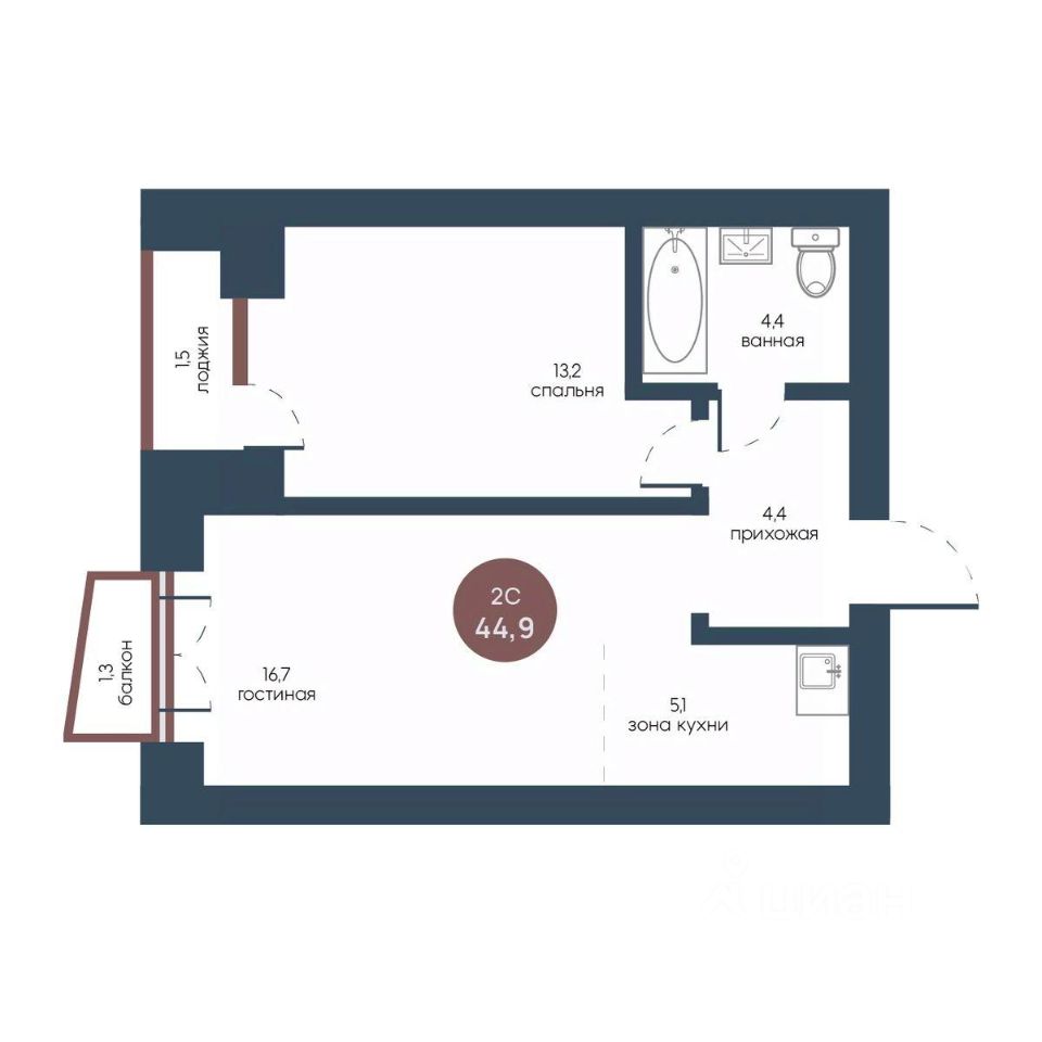 Продаётся 2-комнатная квартира в сданном доме (Корпус 2), срок сдачи: IV-кв. 2025, общей площадью 44.9 кв.м., на 5 этаже.