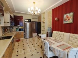 Сделан дизайнерский ремонт с современными качественными материалами, установлены встроенные шкафы, теплые полы, потолок с разными зонами освещения. Кухня занимает 20 квадратных метров, где можно с удовольствием готовить и проводить время с близкими.