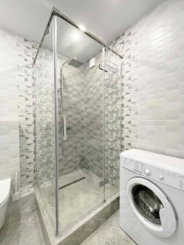 В санузле установлена широкая душевая кабина, теплый пол с таймером.