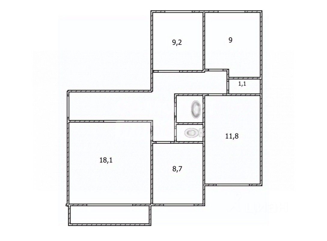 1 Комната (зал) — 18, 1 м, 2 Комната — 9, 2 м, 3-я комната - 9 м, 4-я комната — 12 м. Кухня — 8, 7 м