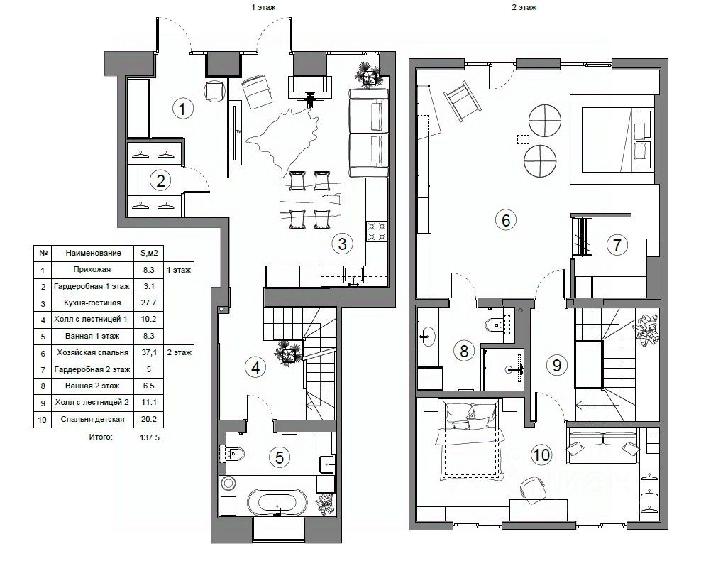 Площадь таунхауса составляет 137,5 квадратных метров, что обеспечивает комфортное пространство для семьи. Помимо трех уютных комнат, вы найдете просторную гостиную, оборудованную кухню и две ванные комнаты.