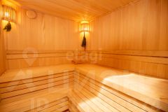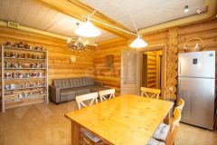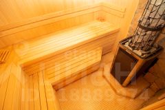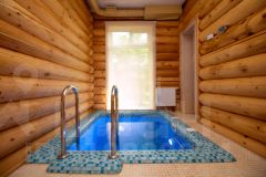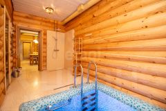 Отдельно стоящая баня из оцилиндрованного кедра диаметром 28 см оборудована круглогодичным бассейном с противотоком. Комната отдыха вмещает 10-12 человек и оснащена туалетной комнатой и приточно-вытяжной вентиляцией. Панорамные окна позволяют наслаждаться видами на реку как из комнаты отдыха, так и из бассейна. Баня может использоваться как гостевой дом.