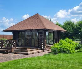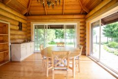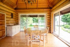 Беседка, рассчитанная на большую компанию, выполнена из оцилиндрованной сосны диаметром 32 см и оснащена французскими панорамными окнами с видом на реку. Здесь также имеется функциональная кухня и водоснабжение.