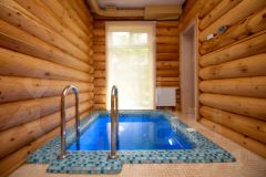 - SPA-комплекс (71 м²): Баня из кедра (28 см) с круглогодичным бассейном (противоток), комнатой отдыха на 10-12 человек и приточно-вытяжной вентиляцией. Панорамные окна выходят прямо на реку.