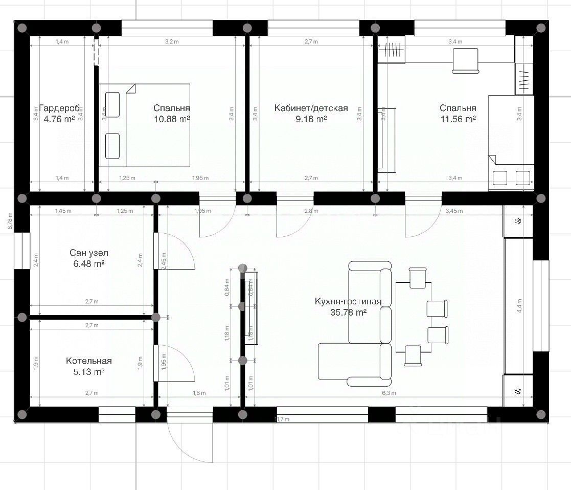 Кухня - гостиная, 3 спальни, гардеробная, сан узел, котельная